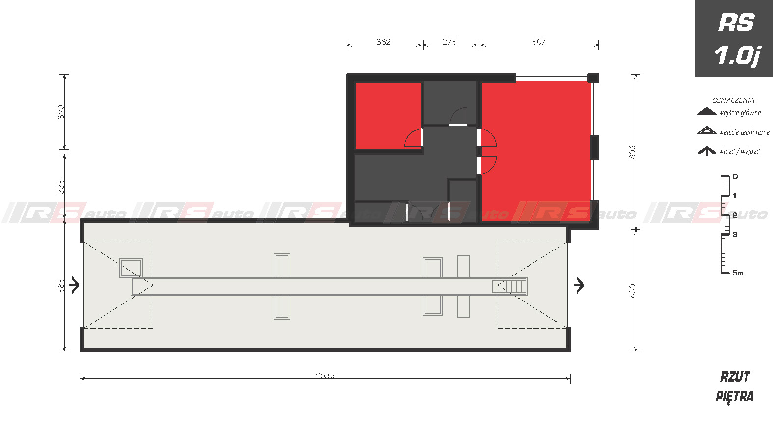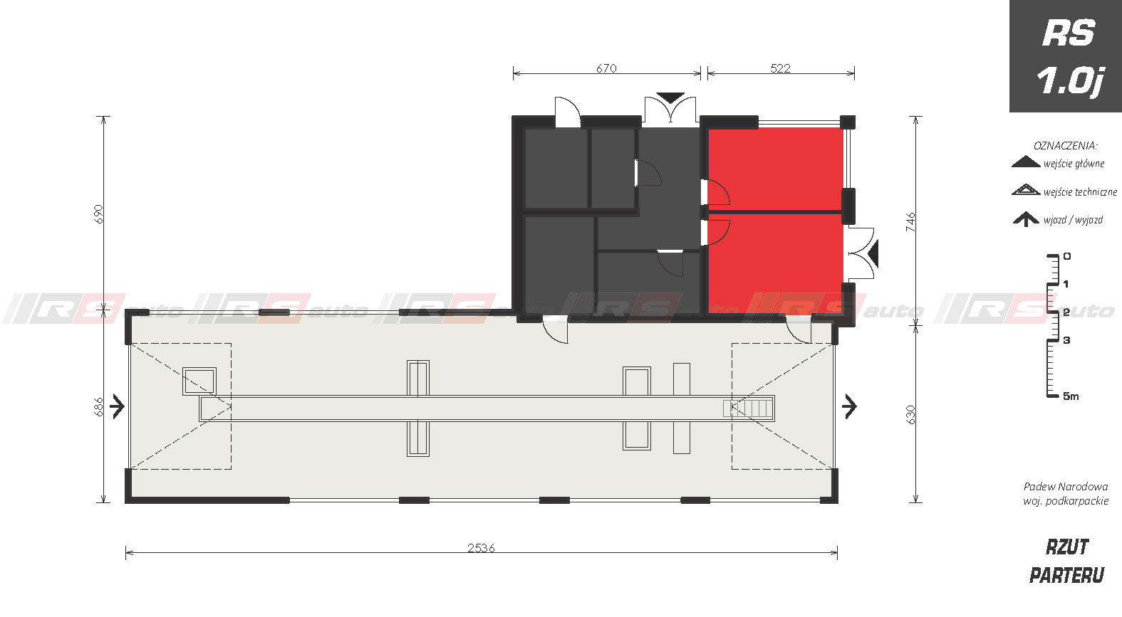 Budynek Okręgowej Stacji Kontroli Pojazdów z jednym stanowiskiem diagnostycznym, zaprojektowany został w technologii mieszanej, cześć socjalno – biurowa – tradycyjna, murowana, część diagnostyczna – szkieletowa. Dwukondygnacyjny w części biurowej z zapleczem biurowym, poczekalnią dla klientów i pomieszczeniami technicznymi, socjalnymi przeznaczonymi dla pracowników stacji, z osobnym wejściem. Długość budynku pozwala na odpowiednie umiejscowienie kanału diagnostycznego oraz wszystkich niezbędnych urządzeń potrzebnych w OSKP.