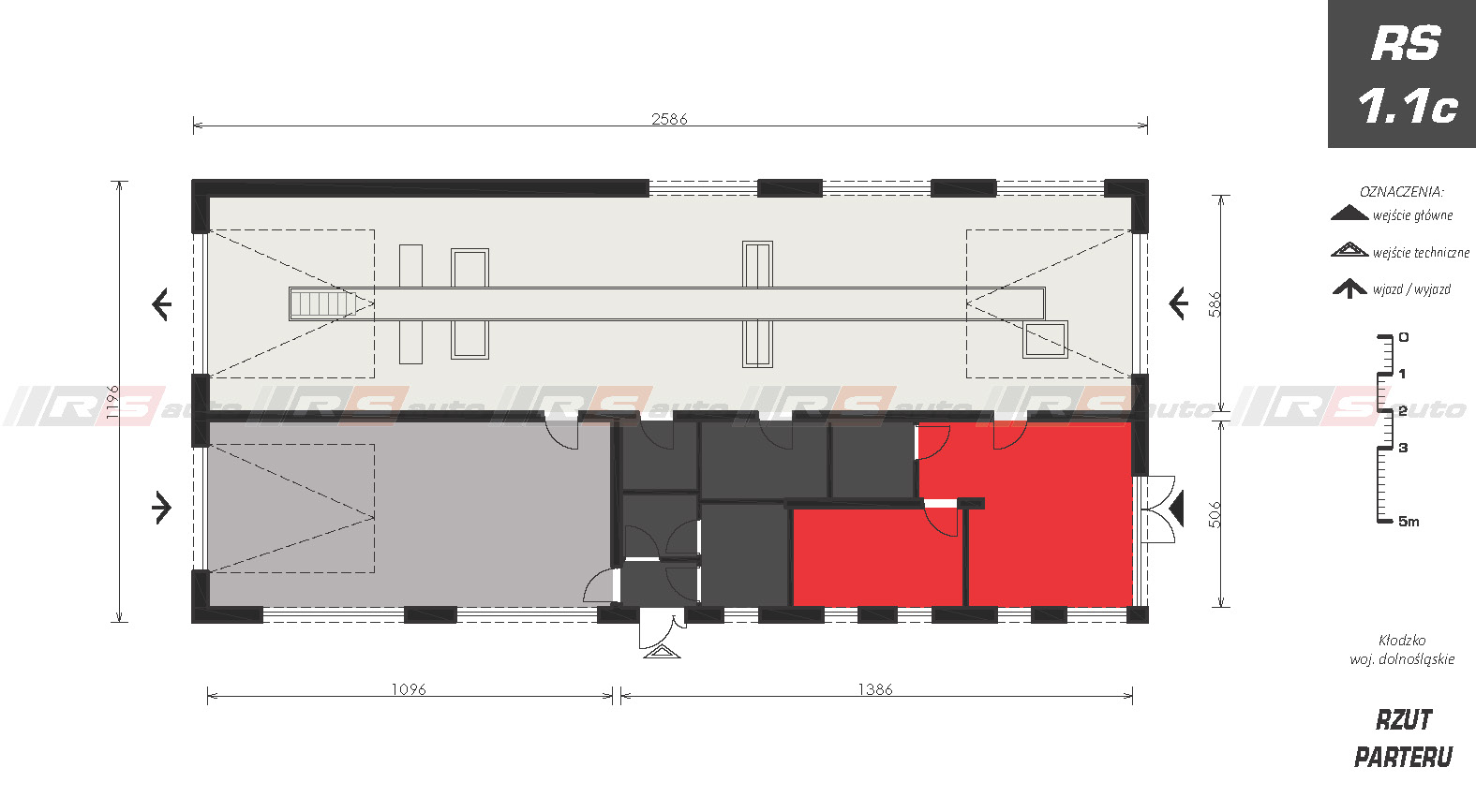 Budynek Okręgowej Stacji Kontroli Pojazdów z jednym stanowiskiem diagnostycznym i jednym stanowiskiem serwisowym, zaprojektowany został w technologii tradycyjnej, murowanej. Jednokondygnacyjny z zapleczem biurowym, poczekalnią dla klientów i pomieszczeniami technicznymi, socjalnymi przeznaczonymi dla pracowników stacji, z osobnym wejściem.
