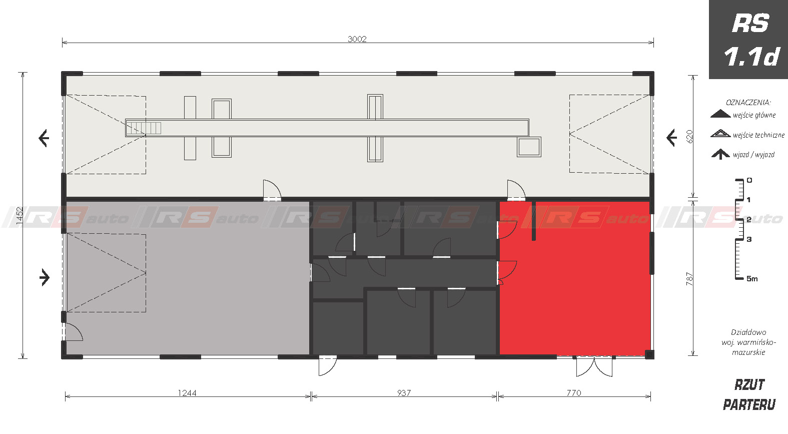 Budynek Okręgowej Stacji Kontroli Pojazdów z jednym stanowiskiem diagnostycznym i jednym stanowiskiem serwisowym, zaprojektowany został w technologii szkieletowej z okładziną z płyt warstwowych. Jednokondygnacyjny z zapleczem biurowym, poczekalnią dla klientów i pomieszczeniami technicznymi, socjalnymi przeznaczonymi dla pracowników. Budynek z powiększonym biurem obsługi klientów, gdzie zlokalizować można dodatkowe stanowisko pracy np. na potrzeby sprzedaży ubezpieczeń komunikacyjnych.