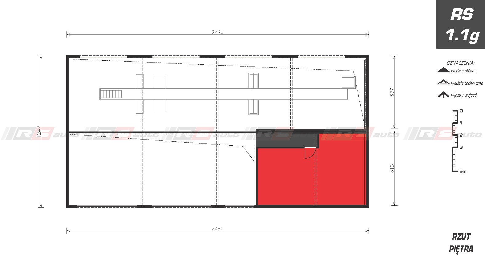 stanowiskiem serwisowym, zaprojektowany został w technologii szkieletowej z okładziną z płyt warstwowych. Jednokondygnacyjny z zapleczem biurowym, poczekalnią dla klientów i pomieszczeniami technicznymi, socjalnymi przeznaczonymi dla pracowników stacji. W budynku zaprojektowano poddasze nieużytkowe, które może zostać wykorzystane na dodatkową przestrzeń magazynową (brak możliwości realizacji piętra biurowego lub pomieszczeń socjalnych na poddaszu).