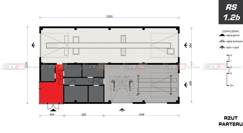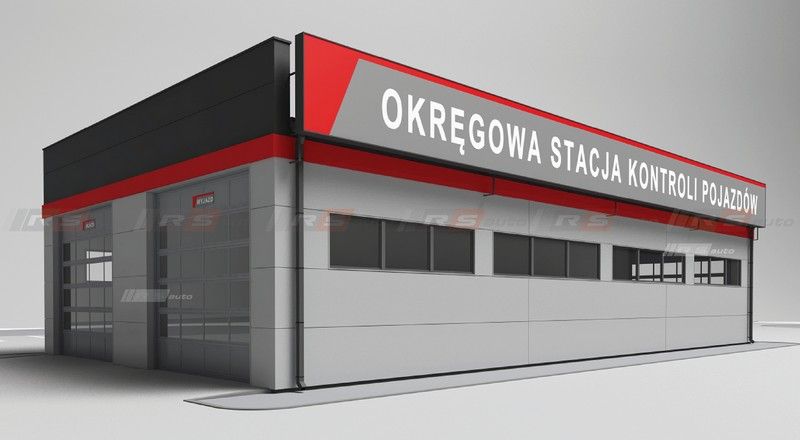 Budynek Okręgowej Stacji Kontroli Pojazdów z jednym stanowiskiem diagnostycznym i dwoma stanowiskami serwisowymi. Zaprojektowany w technologii szkieletowej z okładziną z płyt warstwowych. Jednokondygnacyjny z zapleczem biurowym, poczekalnią dla klientów
