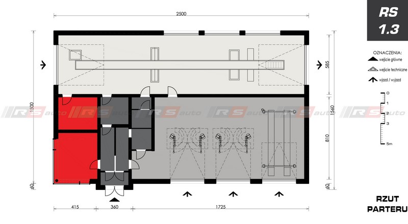 Budynek Okręgowej Stacji Kontroli Pojazdów z jednym stanowiskiem diagnostycznym i trzema stanowiskami serwisowymi. Sztandarowy projekt RS AUTO realizowany w wielu wariantach na terenie całego kraju. Zaprojektowany w technologii tradycyjnej, murowanej. Dwukondygnacyjny