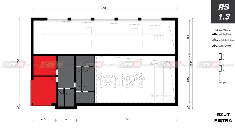 z zapleczem biurowym, poczekalnią dla klientów i pomieszczeniami technicznymi, socjalnymi przeznaczonymi dla pracowników stacji. Piętro przeznaczone na funkcję biurową.