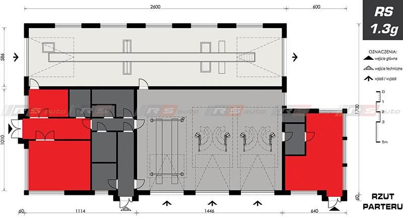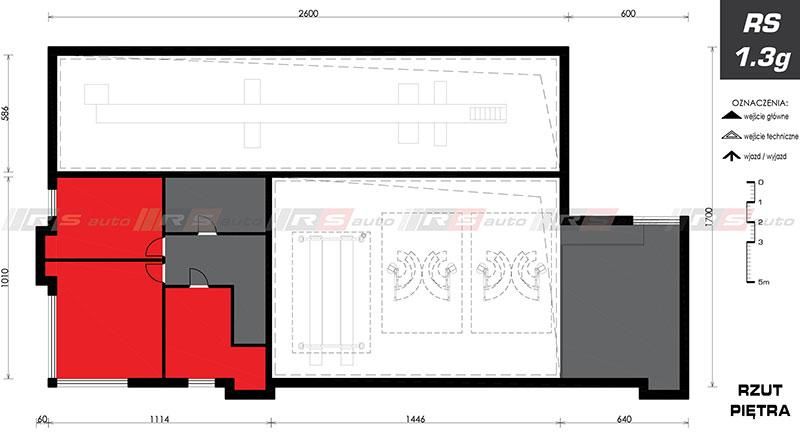 z zapleczem biurowym, poczekalnią dla klientów i pomieszczeniami technicznymi, socjalnymi przeznaczonymi dla pracowników stacji. Piętro przeznaczone na funkcję biurową. W stosunku do budynku RS 1.3A, zmieniono lokalizację głównego wejścia , układ pomieszczeń w części socjalno-biurowej, dodano dodatkową część biurową przy serwisie tym samym zmianie uległy gabaryty obiektu