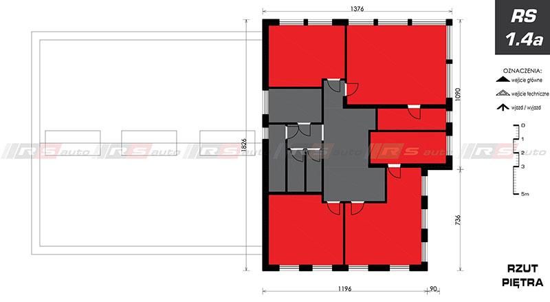 z zapleczem biurowym, poczekalnią dla klientów i pomieszczeniami technicznymi, socjalnymi przeznaczonymi dla pracowników stacji. Piętro przeznaczone na funkcję biurową.