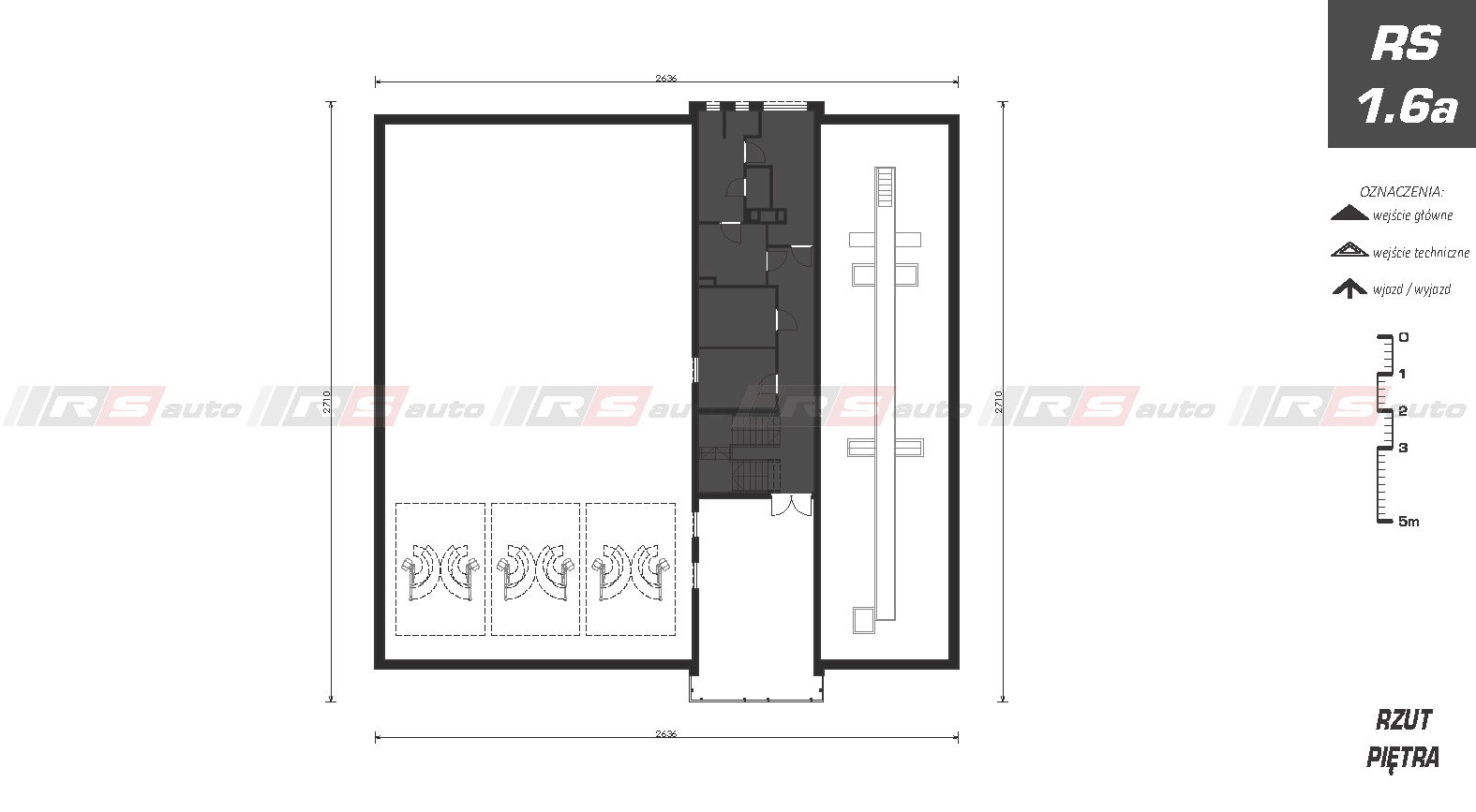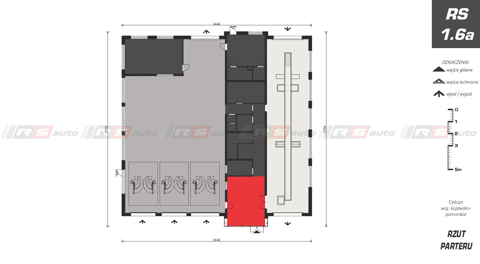 Budynek Okręgowej Stacji Kontroli Pojazdów z jednym stanowiskiem diagnostycznym i sześcioma stanowiskami serwisowymi. Zaprojektowany w technologii tradycyjnej, murowanej. Dwukondygnacyjny z zapleczem biurowym, poczekalnią dla klientów i pomieszczeniami technicznymi, socjalnymi przeznaczonymi dla pracowników stacji. Piętro przeznaczone na funkcję biurową.