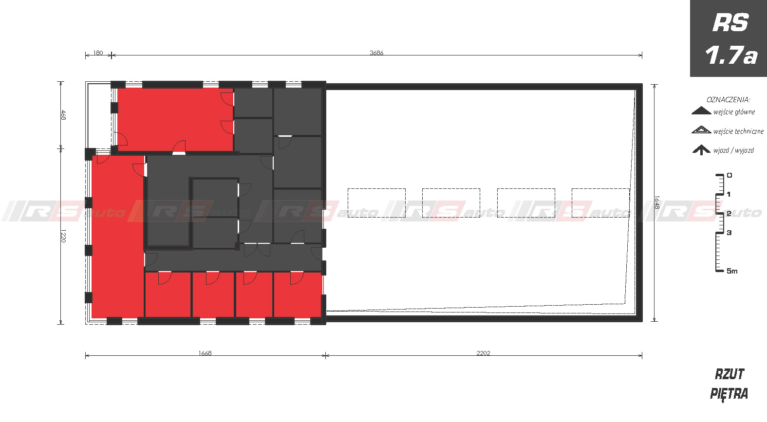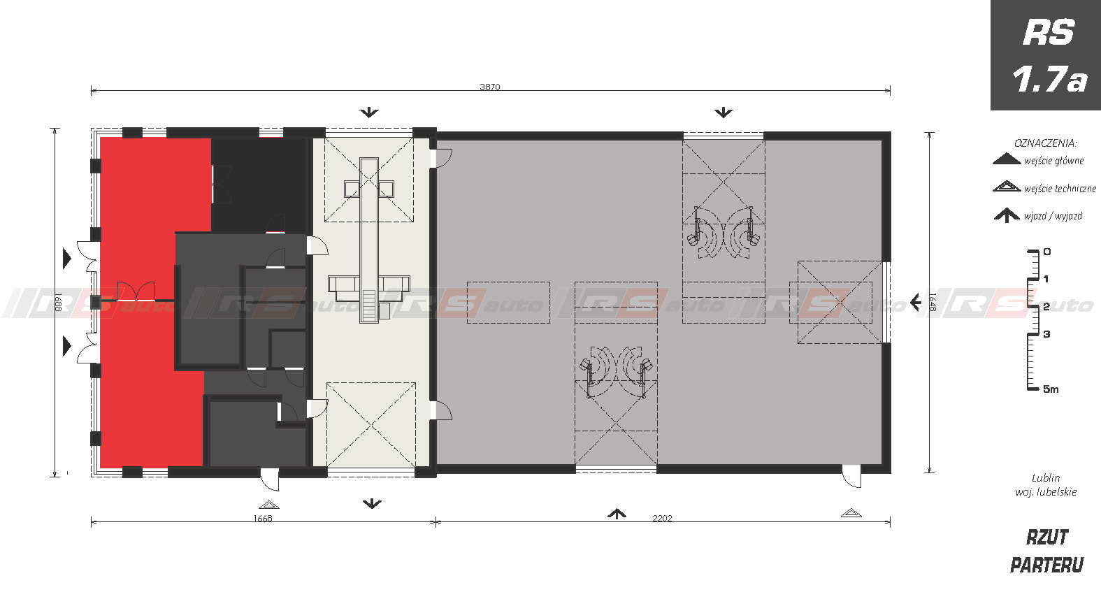 Budynek Okręgowej Stacji Kontroli Pojazdów z jednym stanowiskiem diagnostycznym i siedmioma stanowiskami serwisowymi. Zaprojektowany w technologii tradycyjnej, murowanej (część biurowa)i w technologii szkieletowej z okładziną z płyt warstwowych (serwis). Dwukondygnacyjny z zapleczem biurowym, poczekalnią dla klientów i pomieszczeniami technicznymi, socjalnymi przeznaczonymi dla pracowników stacji. Piętro przeznaczone na funkcję biurową.