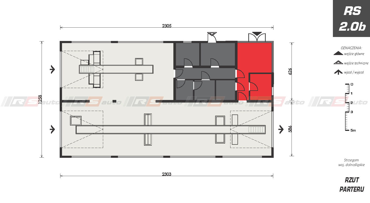 Długość budynku pozwala na odpowiednie umiejscowienie kanału diagnostycznego oraz wszystkich niezbędnych urządzeń potrzebnych w OSKP.