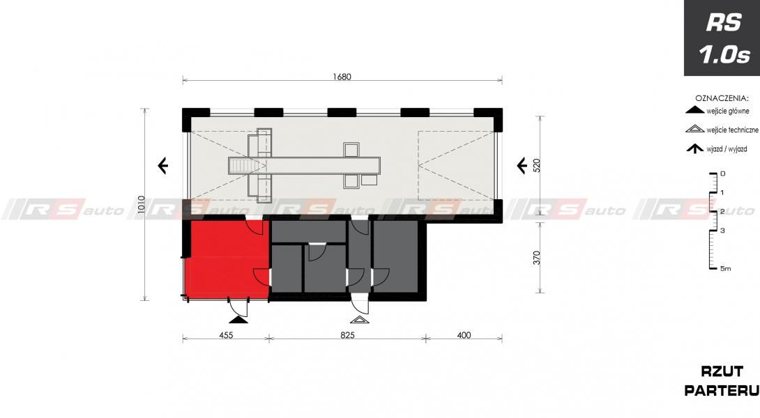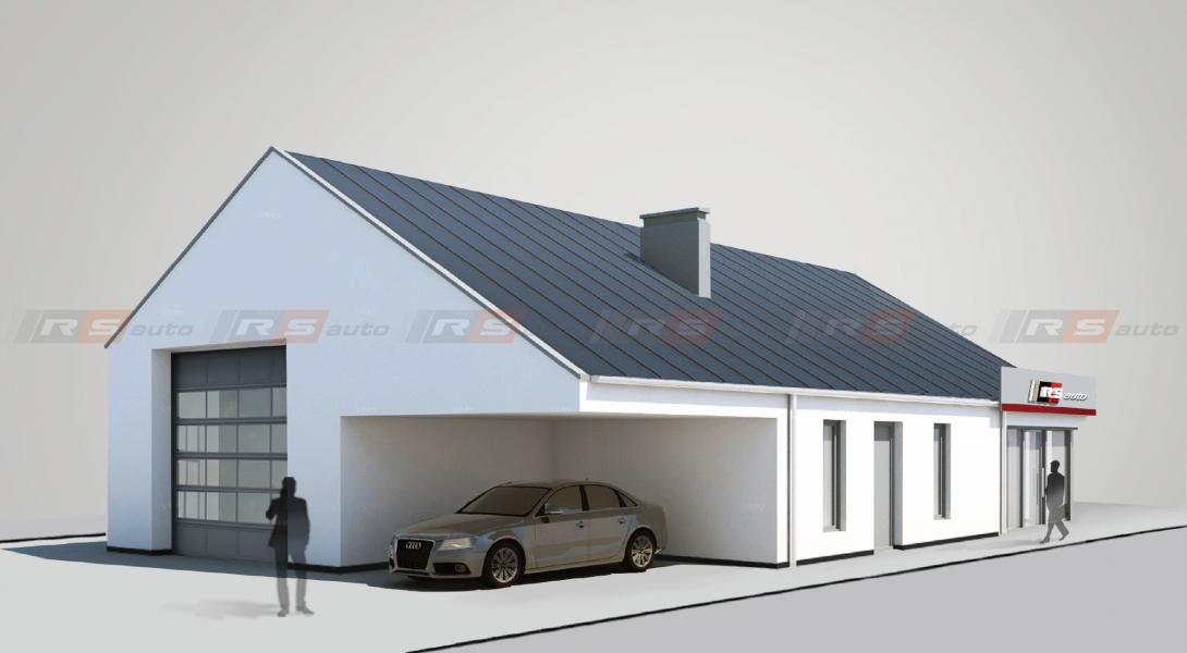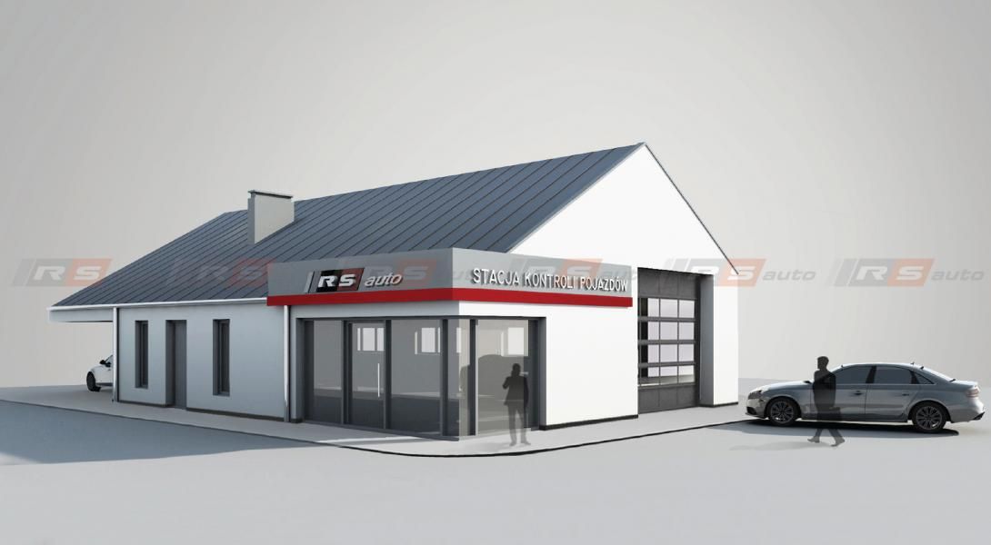 Budynek Podstawowej Stacji Kontroli Pojazdów z jednym stanowiskiem diagnostycznym, zaprojektowany został w technologii tradycyjnej, murowanej. Jednokondygnacyjny z zapleczem biurowym, pomieszczeniami technicznymi i socjalnymi przeznaczonymi dla pracowników stacji. Budynek RS 1.0S jest jednym z najmniejszych z dostępnych budynków Stacji Kontroli Pojazdów. Budynek z dachem dwuspadowym może sprostać wymaganiom narzuconym w planie miejscowym lub w decyzji o warunkach zabudowy.