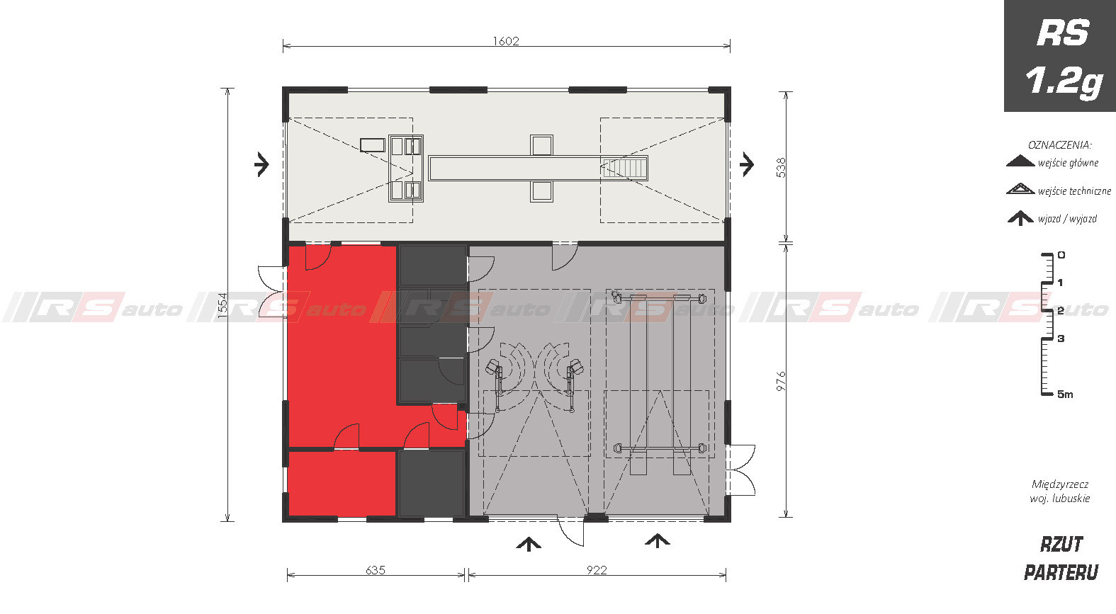 Budynek Podstawowej Stacji Kontroli Pojazdów z jednym stanowiskiem diagnostycznym i dwoma stanowiskami serwisowymi. Zaprojektowany w technologii szkieletowej z okładziną z płyt warstwowych. Budynek jednokondygnacyjny. W budynku zaprojektowano wymagane przepisami zaplecze biurowe i pomieszczenia socjalne przeznaczone dla pracowników serwisu. Budynek o powiększonej i lepiej doświetlonej przestrzeni biurowej, dedykowany do szerokiej działki.