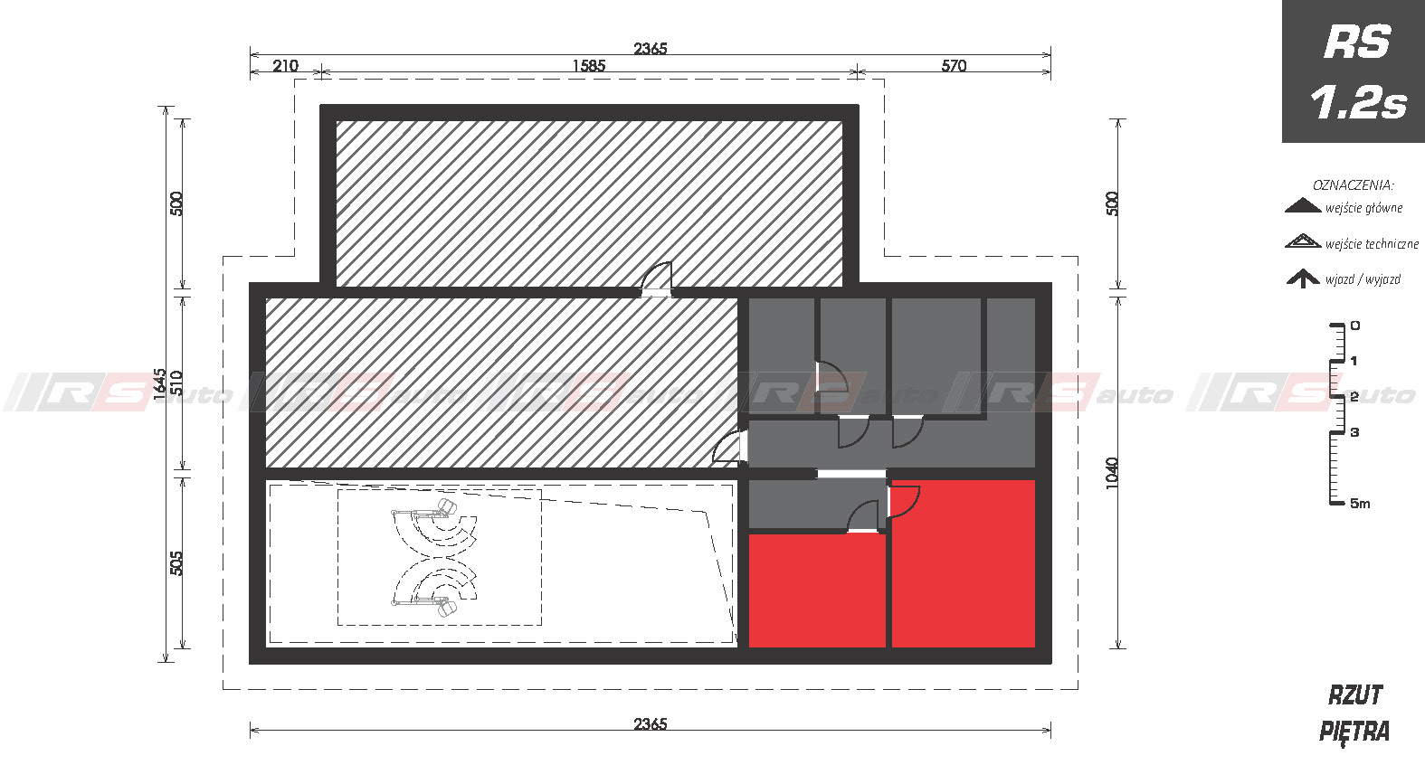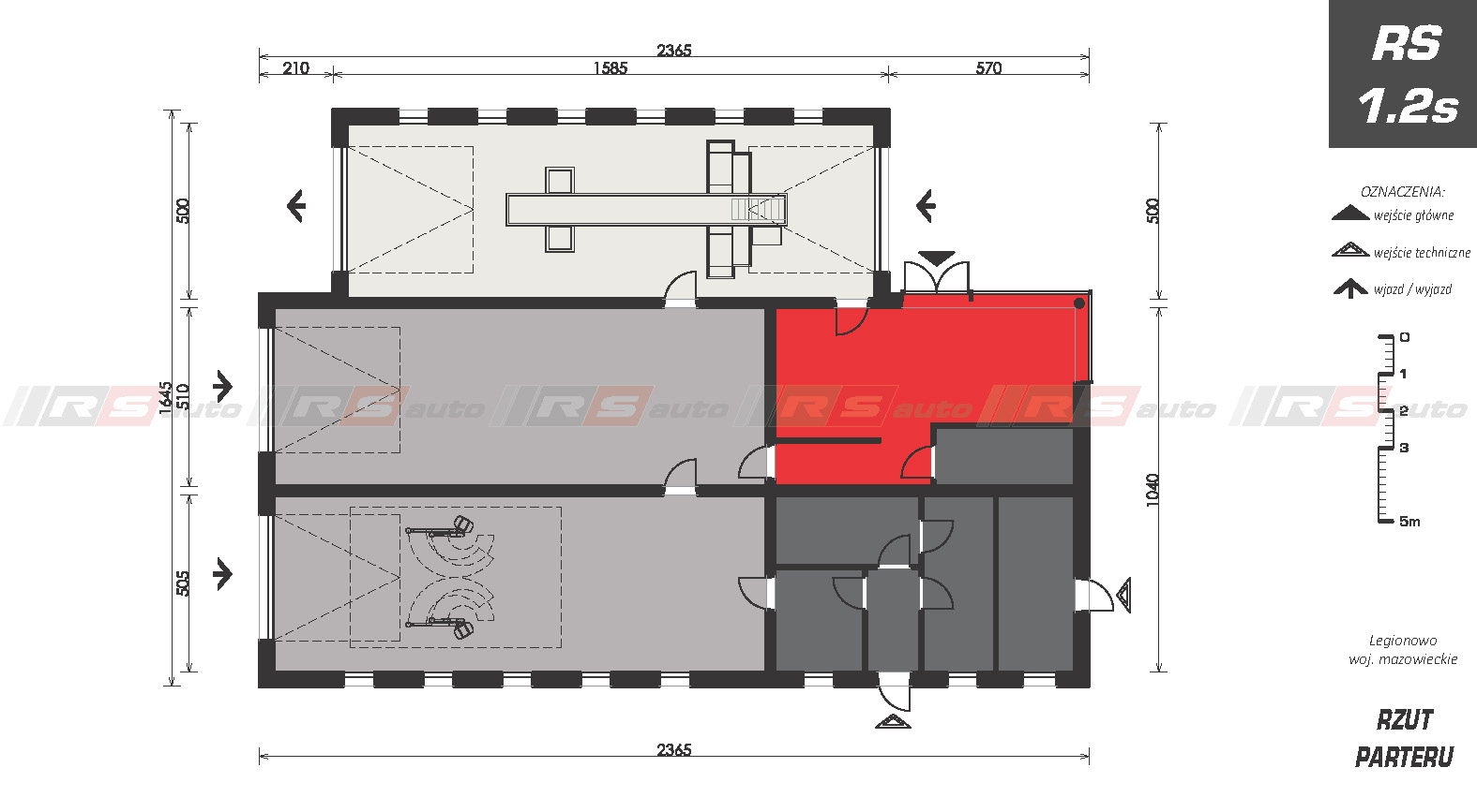 Budynek Podstawowej Stacji Kontroli Pojazdów z jednym stanowiskiem diagnostycznym i dwoma stanowiskami serwisowymi. Zaprojektowany w technologii tradycyjnej, murowanej. Budynek dwukondygnacyjny z poddaszem użytkowym. W budynku zaprojektowano wymagane przepisami zaplecze biurowe i pomieszczenia socjalne przeznaczone dla pracowników serwisu.