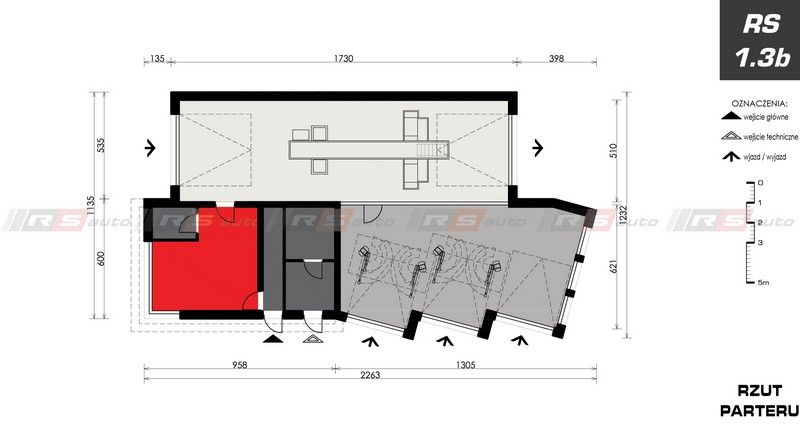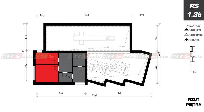 Budynek Podstawowej Stacji Kontroli Pojazdów z jednym stanowiskiem diagnostycznym i trzema stanowiskami serwisowymi. Zaprojektowany w technologii tradycyjnej, murowanej. Dwukondygnacyjny z zapleczem biurowym i pomieszczeniami technicznymi, socjalnymi przeznaczonymi dla pracowników serwisu. Piętro przeznaczone na funkcję biurową. Budynek realizowany na wąskiej działce, niepozwalającej na standardowy układ pomieszczeń serwisowych.