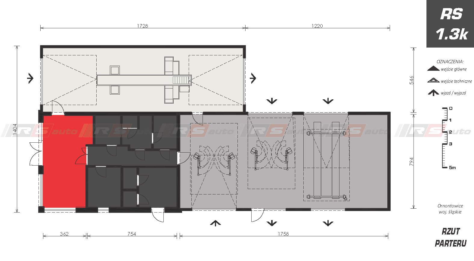 Budynek Podstawowej Stacji Kontroli Pojazdów z jednym stanowiskiem diagnostycznym i trzema stanowiskami serwisowymi. Zaprojektowany w technologii tradycyjnej, murowanej (część biurowa)i w technologii szkieletowej z okładziną z płyt warstwowych (serwis i diagnostyka). Jednokondygnacyjny z zapleczem biurowym i pomieszczeniami socjalnymi przeznaczonymi dla pracowników stacji.